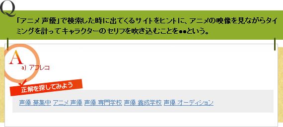 Q「アニメ 声優」で検索した時に出てくるサイトをヒントに、アニメの映像を見ながらタイミングを計ってキャラクターのセリフを吹き込むことを●●という。