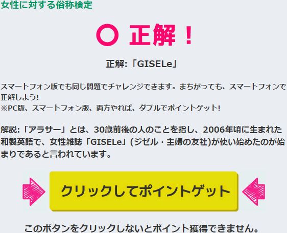 A『「GISELe」』 解説:「アラサー」とは、30歳前後の人のことを指し、2006年頃に生まれた和製英語で、女性雑誌「GISELe」(ジゼル・主婦の友社)が使い始めたのが始まりであると言われています。