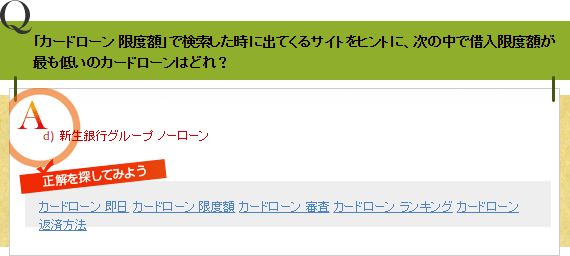 Q「カードローン 限度額」で検索した時に出てくるサイトをヒントに、次の中で借入限度額が最も低いのカードローンはどれ?