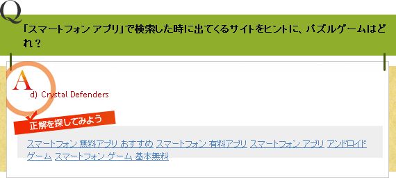 Q「スマートフォン アプリ」で検索した時に出てくるサイトをヒントに、パズルゲームはどれ?