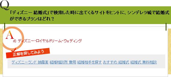 Q「ディズニー 結婚式」で検索した時に出てくるサイトをヒントに、シンデレラ城で結婚式ができるプランはどれ?