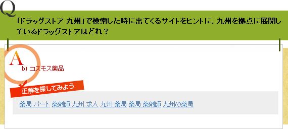 Q「ドラッグストア 九州」で検索した時に出てくるサイトをヒントに、九州を拠点に展開しているドラッグストアはどれ?
