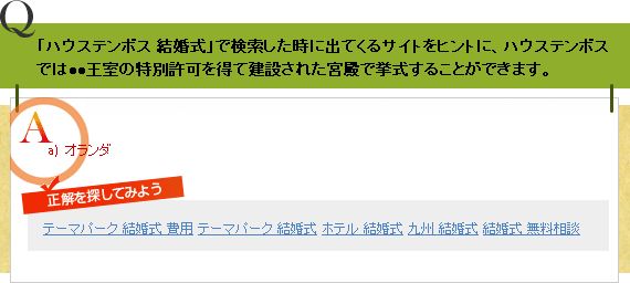 Q「ハウステンボス 結婚式」で検索した時に出てくるサイトをヒントに、ハウステンボスでは●●王室の特別許可を得て建設された宮殿で挙式することができます。