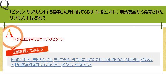 Q「ビタミン サプリメント」で検索した時に出てくるサイトをヒントに、明治薬品から発売されたサプリメントはどれ?