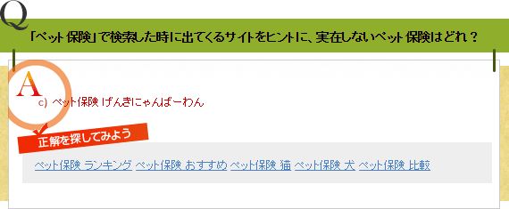 Q「ペット保険」で検索した時に出てくるサイトをヒントに、実在しないペット保険はどれ?