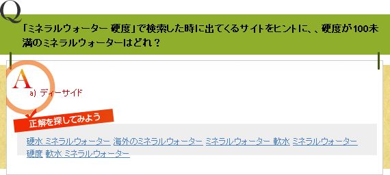 Q「ミネラルウォーター 硬度」で検索した時に出てくるサイトをヒントに、、硬度が100未満のミネラルウォーターはどれ?