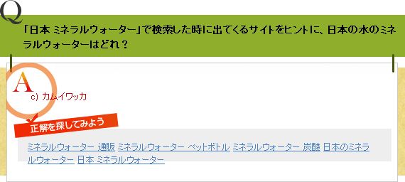 Q「日本 ミネラルウォーター」で検索した時に出てくるサイトをヒントに、日本の水のミネラルウォーターはどれ?