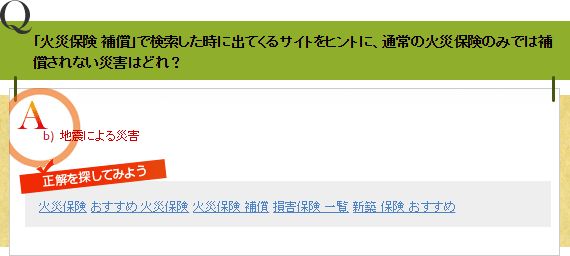 Q「火災保険 補償」で検索した時に出てくるサイトをヒントに、通常の火災保険のみでは補償されない災害はどれ?