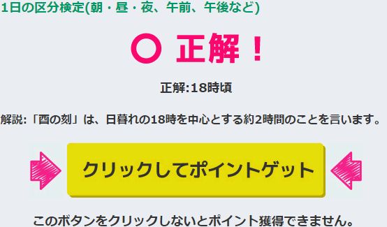 A『18時頃』 解説:「酉の刻」は、日暮れの18時を中心とする約2時間のことを言います。Q「酉の刻」とは、現在の何時頃のことをいう?