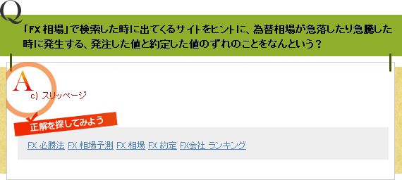 Q「FX 相場」で検索した時に出てくるサイトをヒントに、為替相場が急落したり急騰した時に発生する、発注した値と約定した値のずれのことをなんという?