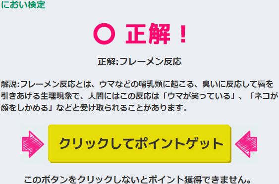 A『フレーメン反応』 解説:フレーメン反応とは、ウマなどの哺乳類に起こる、臭いに反応して唇を引きあげる生理現象で、人間にはこの反応は「ウマが笑っている」、「ネコが顔をしかめる」などと受け取られることがあります。