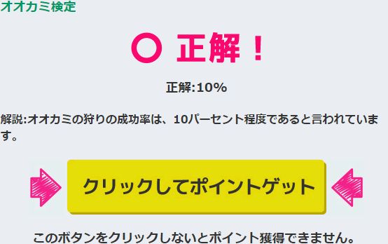 A『10%』 解説:オオカミの狩りの成功率は、10パーセント程度であると言われています。