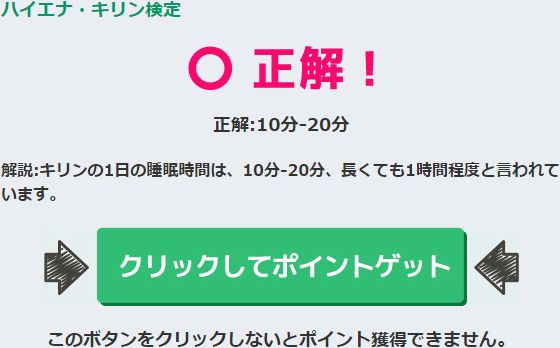 A『10分-20分』 解説:キリンの1日の睡眠時間は、10分-20分、長くても1時間程度と言われています。