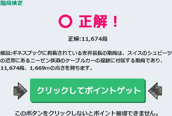 A『11,674段』 解説:ギネスブックに掲載されている世界最長の階段は、スイスのシュピーツの近郊にあるニーゼン鉄道のケーブルカーの線路に付属する階段であり、11,674段、1,669mの高さを持ちます。