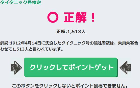 A『1,513人』 解説:1912年4月14日に沈没したタイタニック号の犠牲者数は、乗員乗客合わせて1,513人と言われています。