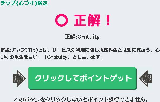 A『Gratuity』 解説:チップ(Tip)とは、サービスの利用に際し規定料金とは別に支払う、心づけの現金を言い、「Gratuity」とも言います。