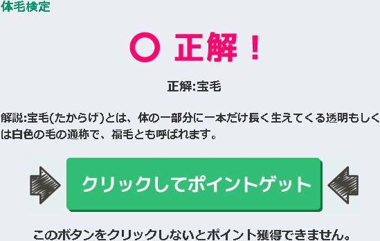 A『宝毛』 解説:宝毛(たからげ)とは、体の一部分に一本だけ長く生えてくる透明もしくは白色の毛の通称で、福毛とも呼ばれます。