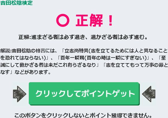 A『進まざる者は必ず退き、退かざる者は必ず進む。』 解説:吉田松陰の格言には、「立志尚特異(志を立てるためには人と異なることを恐れてはならない)」、「百年一瞬耳(百年の時は一瞬にすぎない)」、「至誠にして動かざる者は未だこれ有らざるなり」「志を立ててもって万事の源となす」などがあります。