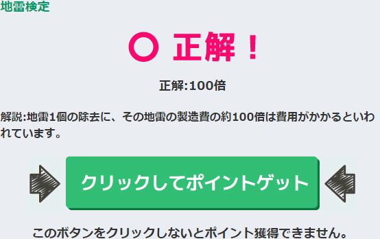 A『100倍』 解説:地雷1個の除去に、その地雷の製造費の約100倍は費用がかかるといわれています。