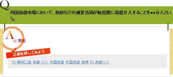 Q外国為替市場において、政府などの通貨当局が秘密裏に為替介入することを●●介入という。