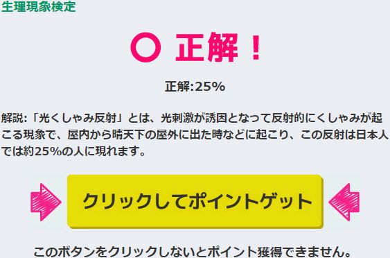 A『25%』 解説:「光くしゃみ反射」とは、光刺激が誘因となって反射的にくしゃみが起こる現象で、屋内から晴天下の屋外に出た時などに起こり、この反射は日本人では約25%の人に現れます。