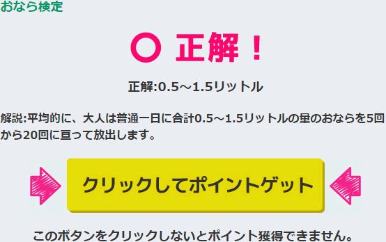 A『0.5~1.5リットル』 解説:平均的に、大人は普通一日に合計0.5~1.5リットルの量のおならを5回から20回に亘って放出します。