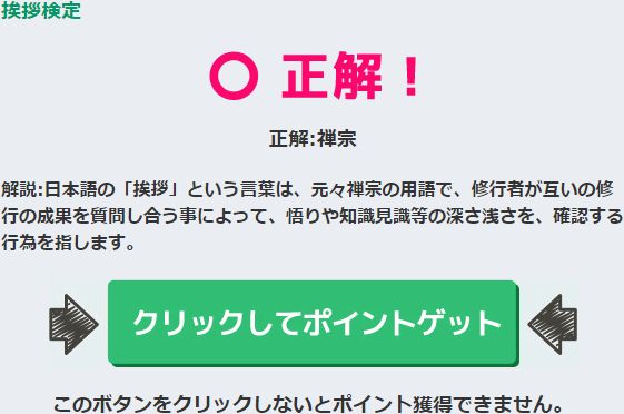 A『禅宗』 解説:日本語の「挨拶」という言葉は、元々禅宗の用語で、修行者が互いの修行の成果を質問し合う事によって、悟りや知識見識等の深さ浅さを、確認する行為を指します。