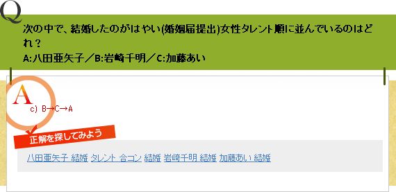 Q次の中で、結婚したのがはやい(婚姻届提出)女性タレント順に並んでいるのはどれ?A:八田亜矢子/B:岩崎千明/C:加藤あい
