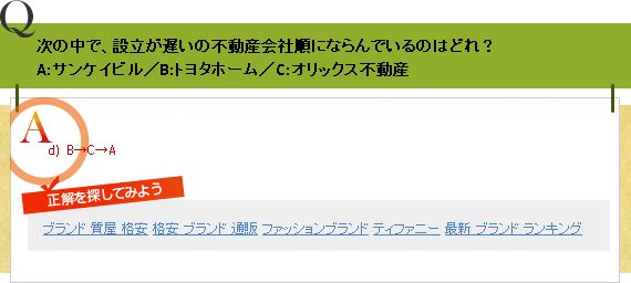 Q次の中で、設立が遅いの不動産会社順にならんでいるのはどれ?A:サンケイビル/B:トヨタホーム/C:オリックス不動産