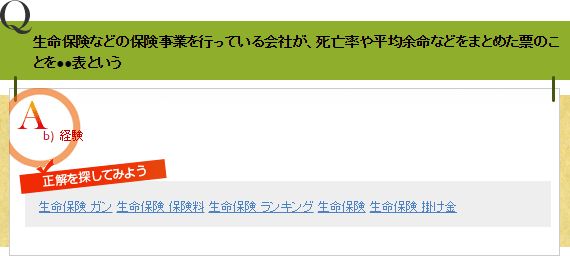 Q生命保険などの保険事業を行っている会社が、死亡率や平均余命などをまとめた票のことを●●表という