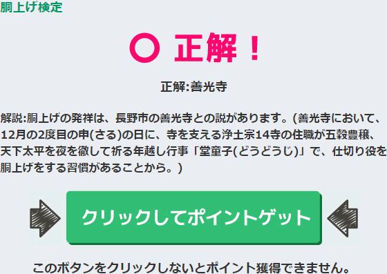 A『善光寺』 解説:胴上げの発祥は、長野市の善光寺との説があります。(善光寺において、12月の2度目の申(さる)の日に、寺を支える浄土宗14寺の住職が五穀豊穣、天下太平を夜を徹して祈る年越し行事「堂童子(どうどうじ)」で、仕切り役を胴上げをする習慣があることから。)