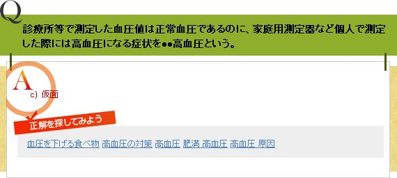 Q診療所等で測定した血圧値は正常血圧であるのに、家庭用測定器など個人で測定した際には高血圧になる症状を●●高血圧という。