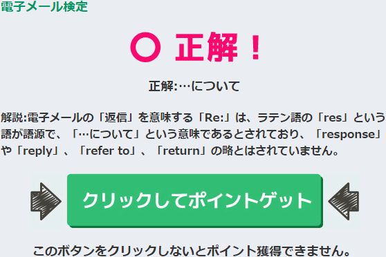 A『…について』 解説:電子メールの「返信」を意味する「Re:」は、ラテン語の「res」という語が語源で、「…について」という意味であるとされており、「response」や「reply」、「refer to」、「return」の略とはされていません。