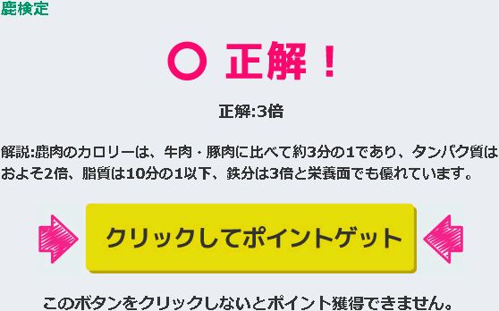 A『3倍』 解説:鹿肉のカロリーは、牛肉・豚肉に比べて約3分の1であり、タンパク質はおよそ2倍、脂質は10分の1以下、鉄分は3倍と栄養面でも優れています。