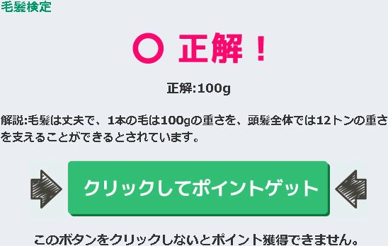 A『100g』 解説:毛髪は丈夫で、1本の毛は100gの重さを、頭髪全体では12トンの重さを支えることができるとされています。