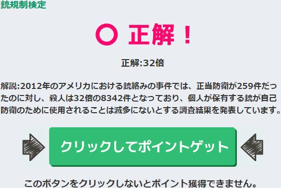 A『32倍』 解説:2012年のアメリカにおける銃絡みの事件では、正当防衛が259件だったのに対し、殺人は32倍の8342件となっており、個人が保有する銃が自己防衛のために使用されることは滅多にないとする調査結果を発表しています。