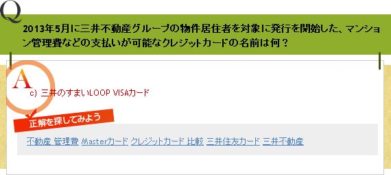 Q2013年5月に三井不動産グループの物件居住者を対象に発行を開始した、マンション管理費などの支払いが可能なクレジットカードの名前は何?